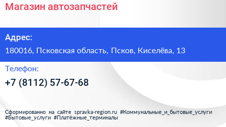 Магазин автозапчастей по адресу 180016, Псковская область, Псков, Киселёва, 13 в дальнейшем Организация, размещена в следующих категориях: