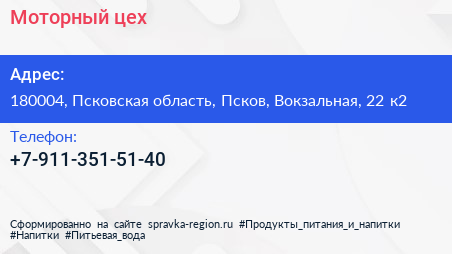 Моторный цех по адресу 180004, Псковская область, Псков, Вокзальная, 22 к2 в дальнейшем Организация, размещена в следующих категориях: