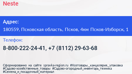 Neste по адресу 180559, Псковская область, Псков, 4км Псков-Изборск, 1 в дальнейшем Организация, размещена в следующих категориях: