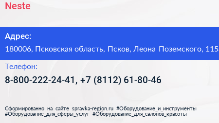 Neste по адресу 180006, Псковская область, Псков, Леона Поземского, 115а в дальнейшем Организация, размещена в следующих категориях:
