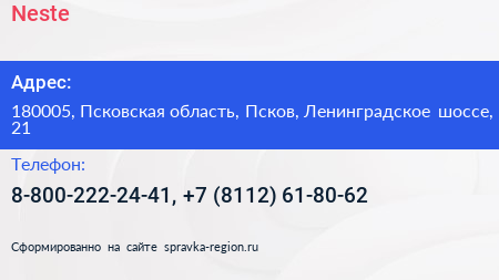 Neste по адресу 180005, Псковская область, Псков, Ленинградское шоссе, 21 в дальнейшем Организация, размещена в следующих категориях: