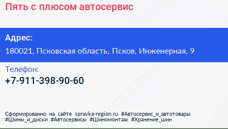 Пять с плюсом, автосервис по адресу 180021, Псковская область, Псков, Инженерная, 9 в дальнейшем Организация, размещена в следующих категориях: