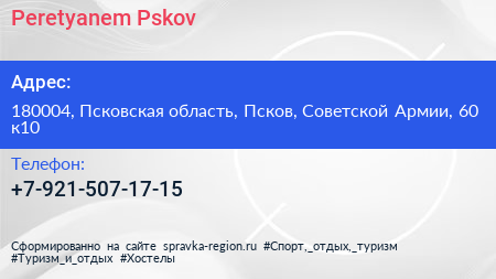 Peretyanem Pskov по адресу 180004, Псковская область, Псков, Советской Армии, 60 к10 в дальнейшем Организация, размещена в следующих категориях: