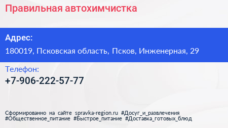 Правильная автохимчистка по адресу 180019, Псковская область, Псков, Инженерная, 29 в дальнейшем Организация, размещена в следующих категориях: