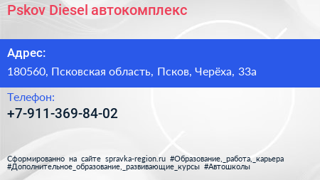 Pskov Diesel, автокомплекс по адресу 180560, Псковская область, Псков, Черёха, 33а в дальнейшем Организация, размещена в следующих категориях: