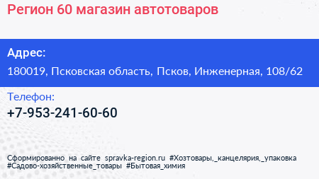 Регион 60, магазин автотоваров по адресу 180019, Псковская область, Псков, Инженерная, 108/62 в дальнейшем Организация, размещена в следующих категориях: