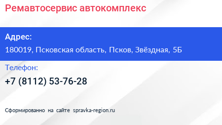 Ремавтосервис, автокомплекс по адресу 180019, Псковская область, Псков, Звёздная, 5Б в дальнейшем Организация, размещена в следующих категориях: