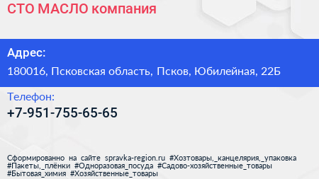 СТО МАСЛО, компания по адресу 180016, Псковская область, Псков, Юбилейная, 22Б в дальнейшем Организация, размещена в следующих категориях: