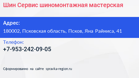 Шин Сервис, шиномонтажная мастерская по адресу 180002, Псковская область, Псков, Яна Райниса, 41 в дальнейшем Организация, размещена в следующих категориях: