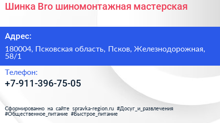 Шинка Bro, шиномонтажная мастерская по адресу 180004, Псковская область, Псков, Железнодорожная, 58/1 в дальнейшем Организация, размещена в следующих категориях:
