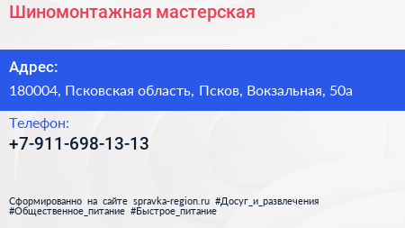 Шиномонтажная мастерская по адресу 180004, Псковская область, Псков, Вокзальная, 50а в дальнейшем Организация, размещена в следующих категориях: