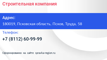 Строительная компания по адресу 180019, Псковская область, Псков, Труда, 58 в дальнейшем Организация, размещена в следующих категориях: