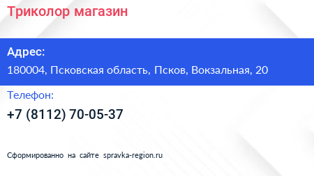 Триколор, магазин по адресу 180004, Псковская область, Псков, Вокзальная, 20 в дальнейшем Организация, размещена в следующих категориях: