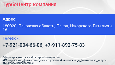 ТурбоЦентр, компания по адресу 180020, Псковская область, Псков, Ижорского Батальона, 16 в дальнейшем Организация, размещена в следующих категориях: