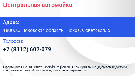 Центральная автомойка по адресу 180000, Псковская область, Псков, Советская, 51 в дальнейшем Организация, размещена в следующих категориях: