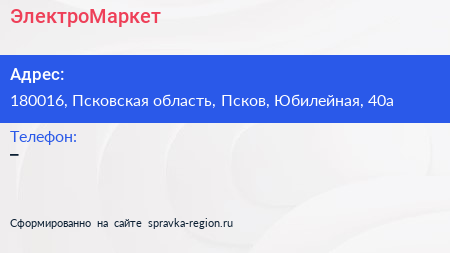 ЭлектроМаркет по адресу 180016, Псковская область, Псков, Юбилейная, 40а в дальнейшем Организация, размещена в следующих категориях: