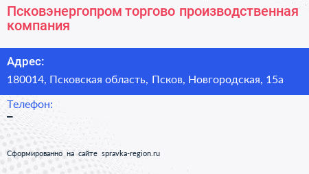 Псковэнергопром, торгово-производственная компания по адресу 180014, Псковская область, Псков, Новгородская, 15а в дальнейшем Организация, размещена в следующих категориях: