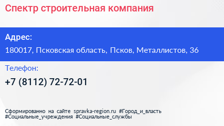 Спектр, строительная компания по адресу 180017, Псковская область, Псков, Металлистов, 36 в дальнейшем Организация, размещена в следующих категориях: