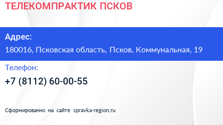 ТЕЛЕКОМПРАКТИК-ПСКОВ по адресу 180016, Псковская область, Псков, Коммунальная, 19 в дальнейшем Организация, размещена в следующих категориях: