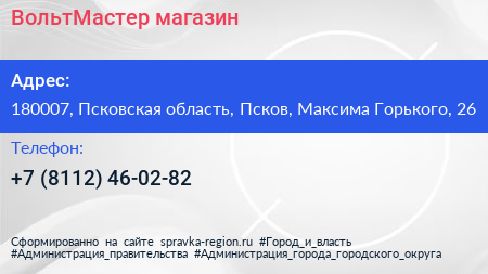 ВольтМастер, магазин по адресу 180007, Псковская область, Псков, Максима Горького, 26 в дальнейшем Организация, размещена в следующих категориях:
