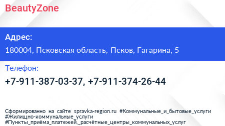 BeautyZone по адресу 180004, Псковская область, Псков, Гагарина, 5 в дальнейшем Организация, размещена в следующих категориях: