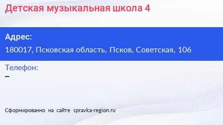 Детская музыкальная школа №4 по адресу 180017, Псковская область, Псков, Советская, 106 в дальнейшем Организация, размещена в следующих категориях: