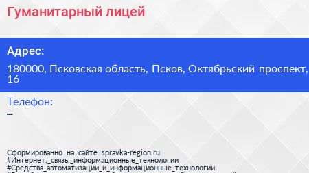 Гуманитарный лицей по адресу 180000, Псковская область, Псков, Октябрьский проспект, 16 в дальнейшем Организация, размещена в следующих категориях: