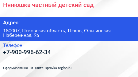 Нянюшка, частный детский сад по адресу 180007, Псковская область, Псков, Ольгинская Набережная, 9а в дальнейшем Организация, размещена в следующих категориях: