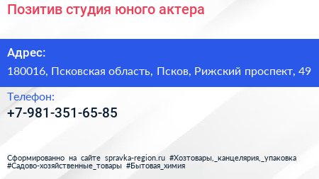Позитив, студия юного актера по адресу 180016, Псковская область, Псков, Рижский проспект, 49 в дальнейшем Организация, размещена в следующих категориях: