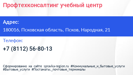 Профтехконсалтинг, учебный центр по адресу 180016, Псковская область, Псков, Народная, 21 в дальнейшем Организация, размещена в следующих категориях: