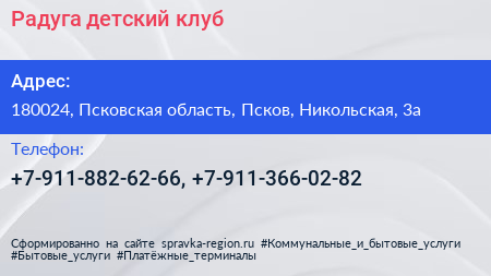 Радуга, детский клуб по адресу 180024, Псковская область, Псков, Никольская, 3а в дальнейшем Организация, размещена в следующих категориях: