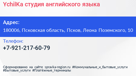 YchilKa, студия английского языка по адресу 180006, Псковская область, Псков, Леона Поземского, 10 в дальнейшем Организация, размещена в следующих категориях: