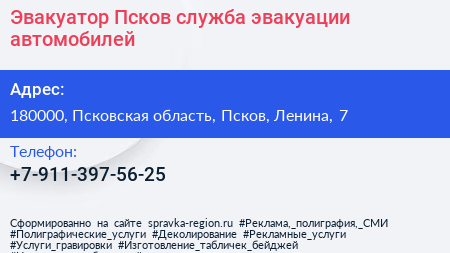 Эвакуатор Псков, служба эвакуации автомобилей по адресу 180000, Псковская область, Псков, Ленина, 7 в дальнейшем Организация, размещена в следующих категориях: