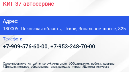КИГ-37, автосервис по адресу 180005, Псковская область, Псков, Зональное шоссе, 32Б в дальнейшем Организация, размещена в следующих категориях: