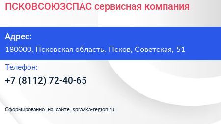 ПСКОВСОЮЗСПАС, сервисная компания по адресу 180000, Псковская область, Псков, Советская, 51 в дальнейшем Организация, размещена в следующих категориях: