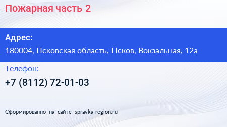 Пожарная часть №2 по адресу 180004, Псковская область, Псков, Вокзальная, 12а в дальнейшем Организация, размещена в следующих категориях: