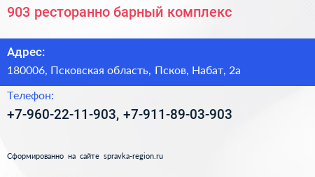 903, ресторанно-барный комплекс по адресу 180006, Псковская область, Псков, Набат, 2а в дальнейшем Организация, размещена в следующих категориях: