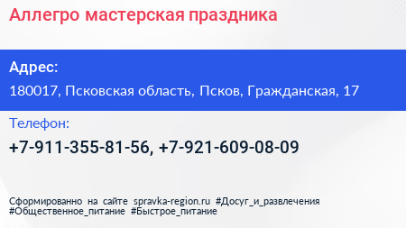 Аллегро, мастерская праздника по адресу 180017, Псковская область, Псков, Гражданская, 17 в дальнейшем Организация, размещена в следующих категориях: