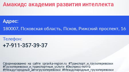 Амакидс, академия развития интеллекта по адресу 180007, Псковская область, Псков, Рижский проспект, 16 в дальнейшем Организация, размещена в следующих категориях: