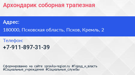 Архондарик, соборная трапезная по адресу 180000, Псковская область, Псков, Кремль, 2 в дальнейшем Организация, размещена в следующих категориях: