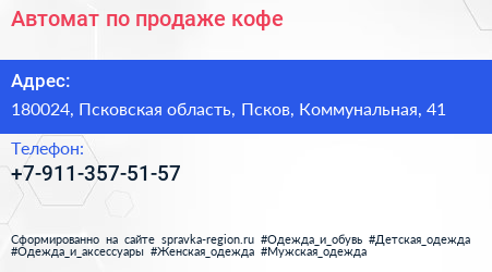 Автомат по продаже кофе по адресу 180024, Псковская область, Псков, Коммунальная, 41 в дальнейшем Организация, размещена в следующих категориях: