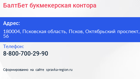 БалтБет, букмекерская контора по адресу 180004, Псковская область, Псков, Октябрьский проспект, 56 в дальнейшем Организация, размещена в следующих категориях: