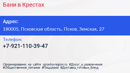 Бани в Крестах по адресу 180005, Псковская область, Псков, Земская, 27 в дальнейшем Организация, размещена в следующих категориях: