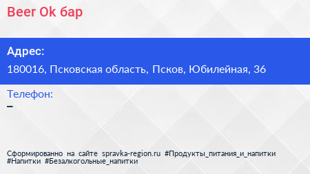 Beer`Ok, бар по адресу 180016, Псковская область, Псков, Юбилейная, 36 в дальнейшем Организация, размещена в следующих категориях: