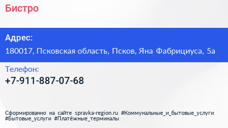 Бистро по адресу 180017, Псковская область, Псков, Яна Фабрициуса, 5а в дальнейшем Организация, размещена в следующих категориях: