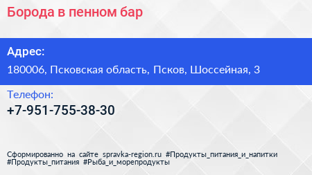 Борода в пенном, бар по адресу 180006, Псковская область, Псков, Шоссейная, 3 в дальнейшем Организация, размещена в следующих категориях: