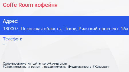Coffe Room, кофейня по адресу 180007, Псковская область, Псков, Рижский проспект, 16а в дальнейшем Организация, размещена в следующих категориях: