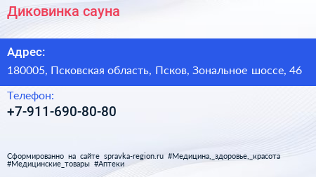 Диковинка, сауна по адресу 180005, Псковская область, Псков, Зональное шоссе, 46 в дальнейшем Организация, размещена в следующих категориях: