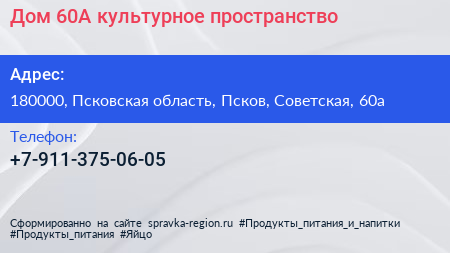 Дом 60А, культурное пространство по адресу 180000, Псковская область, Псков, Советская, 60а в дальнейшем Организация, размещена в следующих категориях: