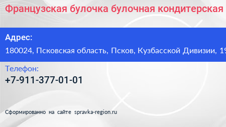 Французская булочка, булочная-кондитерская по адресу 180024, Псковская область, Псков, Кузбасской Дивизии, 19 в дальнейшем Организация, размещена в следующих категориях:
